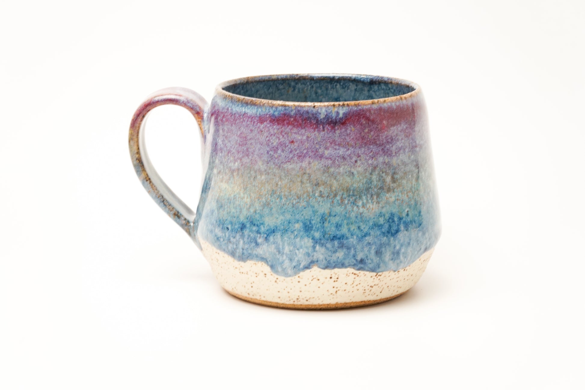 Wheel thrown coffee cup made on speckled tan stoneware clay, with a beautiful colorful glaze effect.