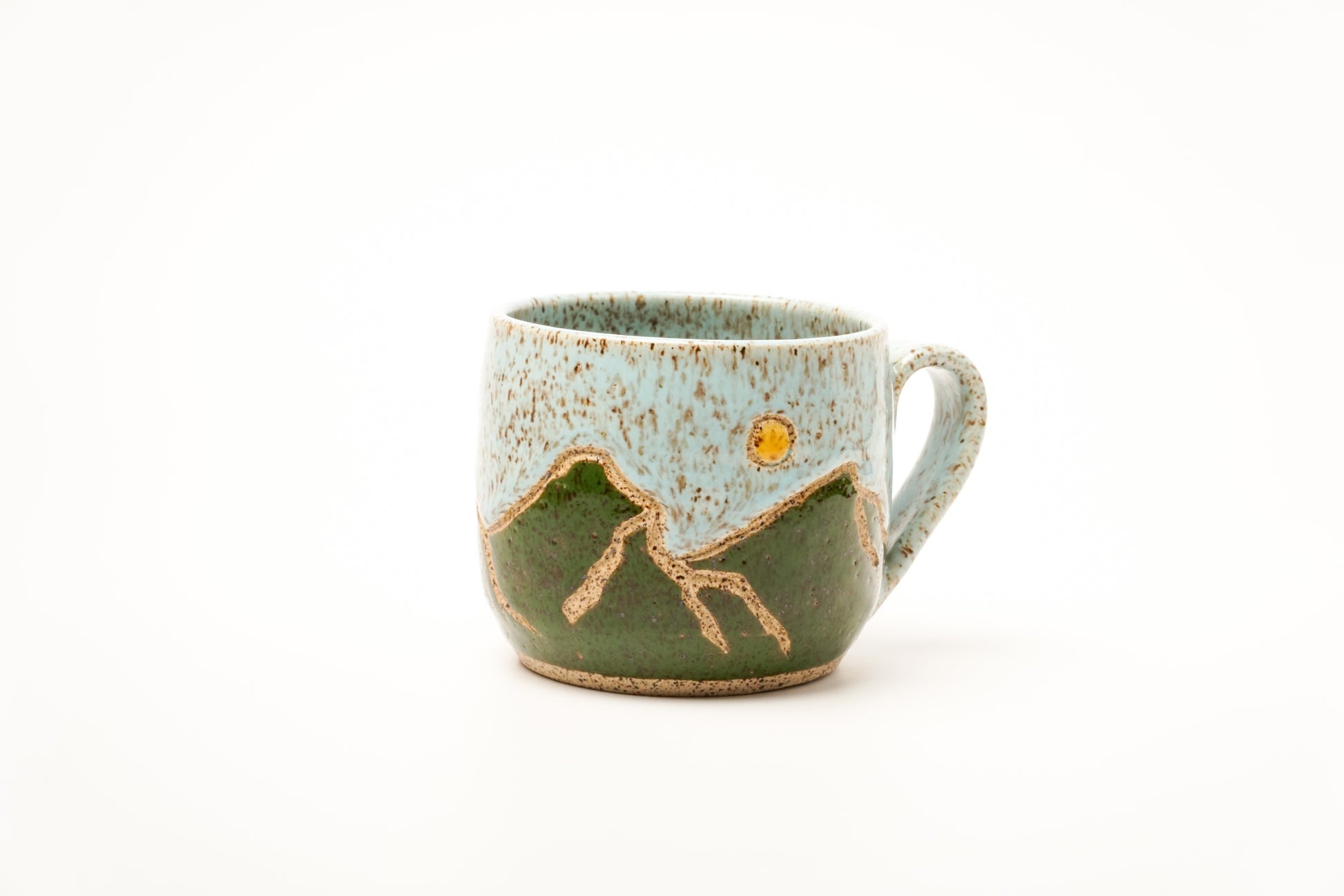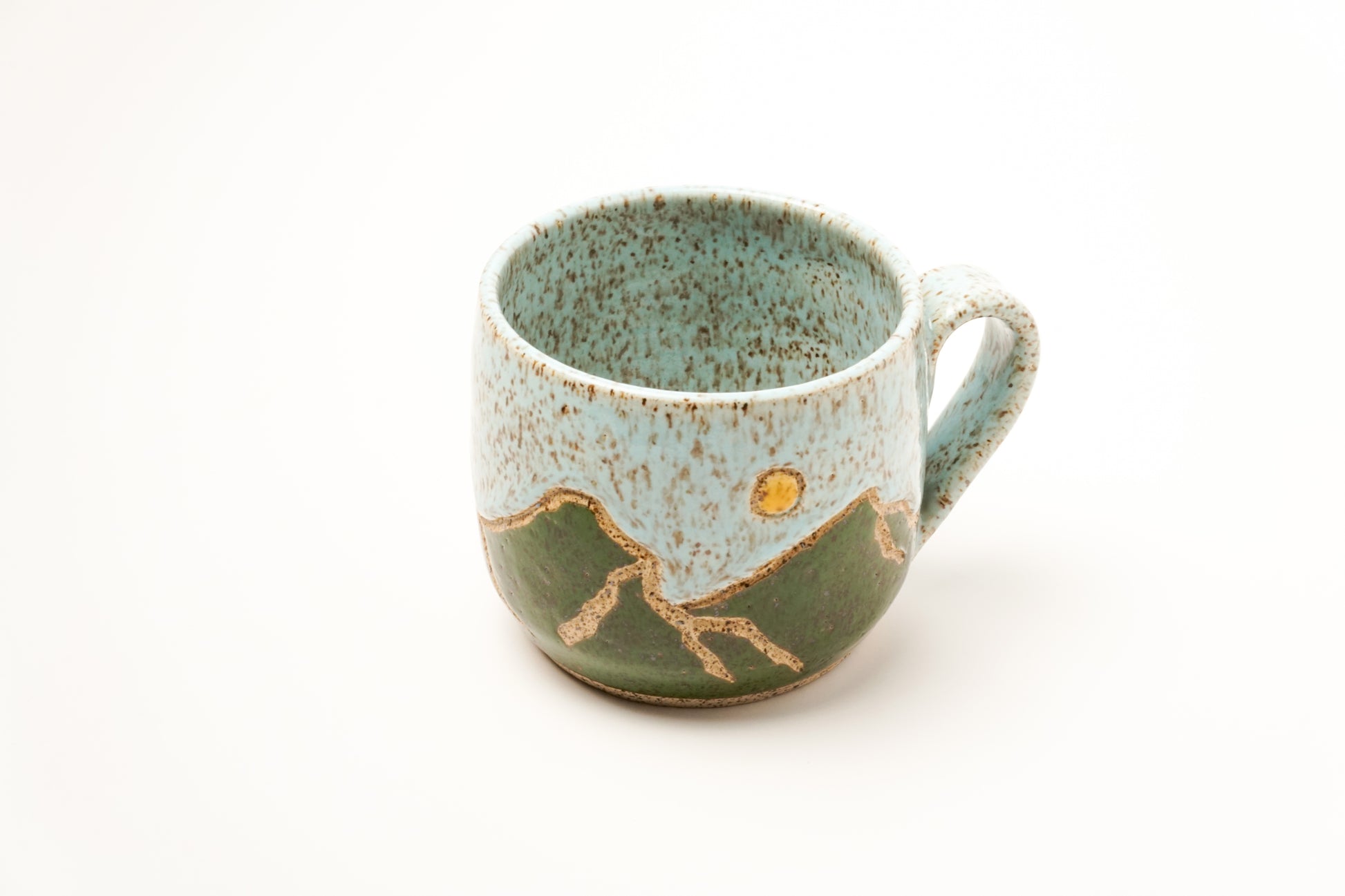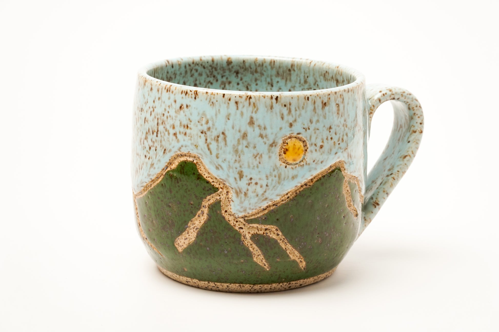 Taza hecha en el torno alfarero en barro gres pecoso creada, tallada y pintada a mano. Inspirada por las montañas de Puerto Rico
