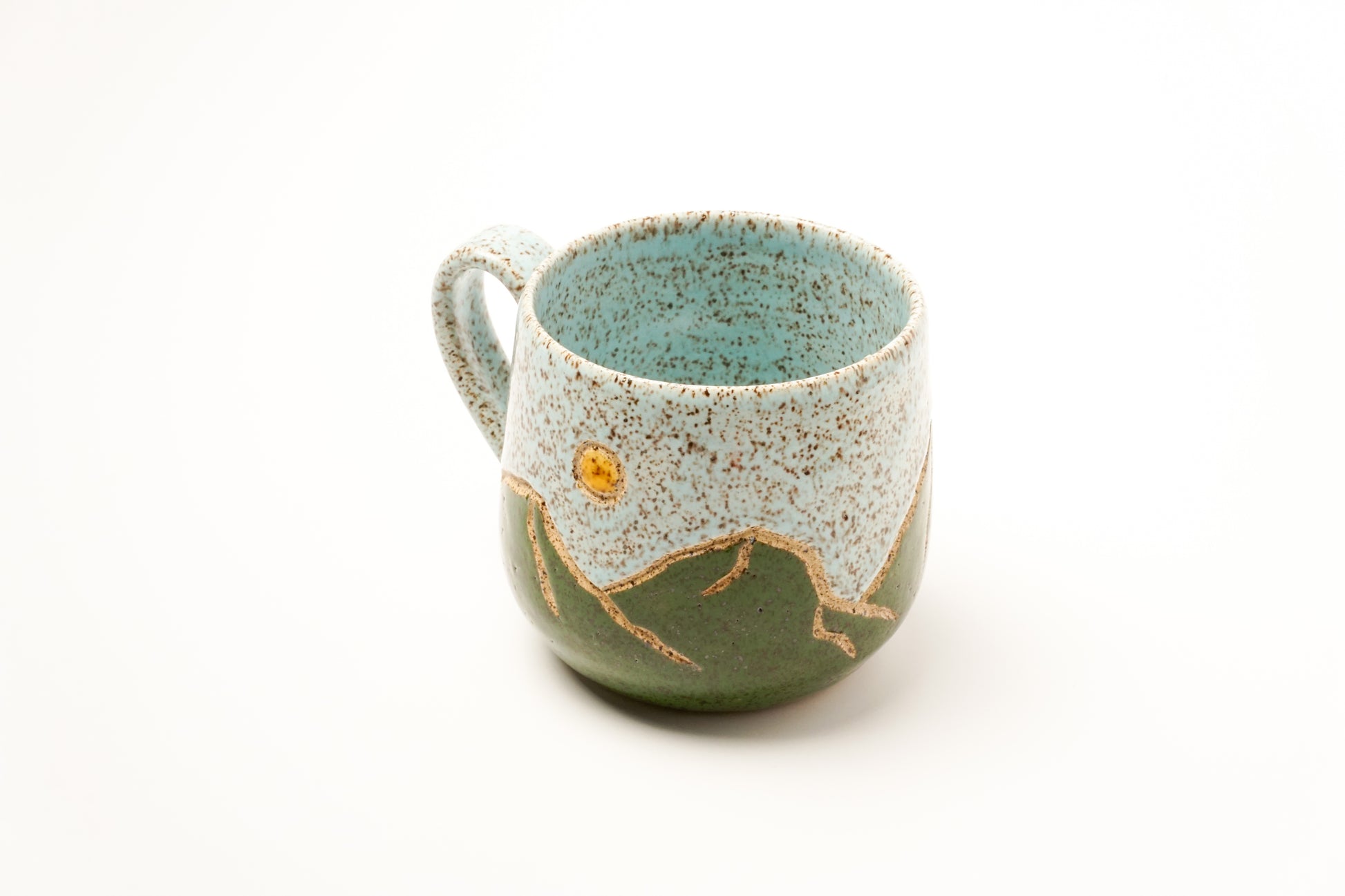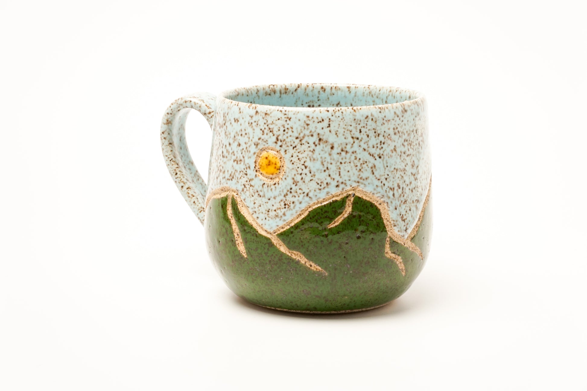 Taza hecha en el torno alfarero en barro gres pecoso creada, tallada y pintada a mano. Inspirada por las montañas de Puerto Rico