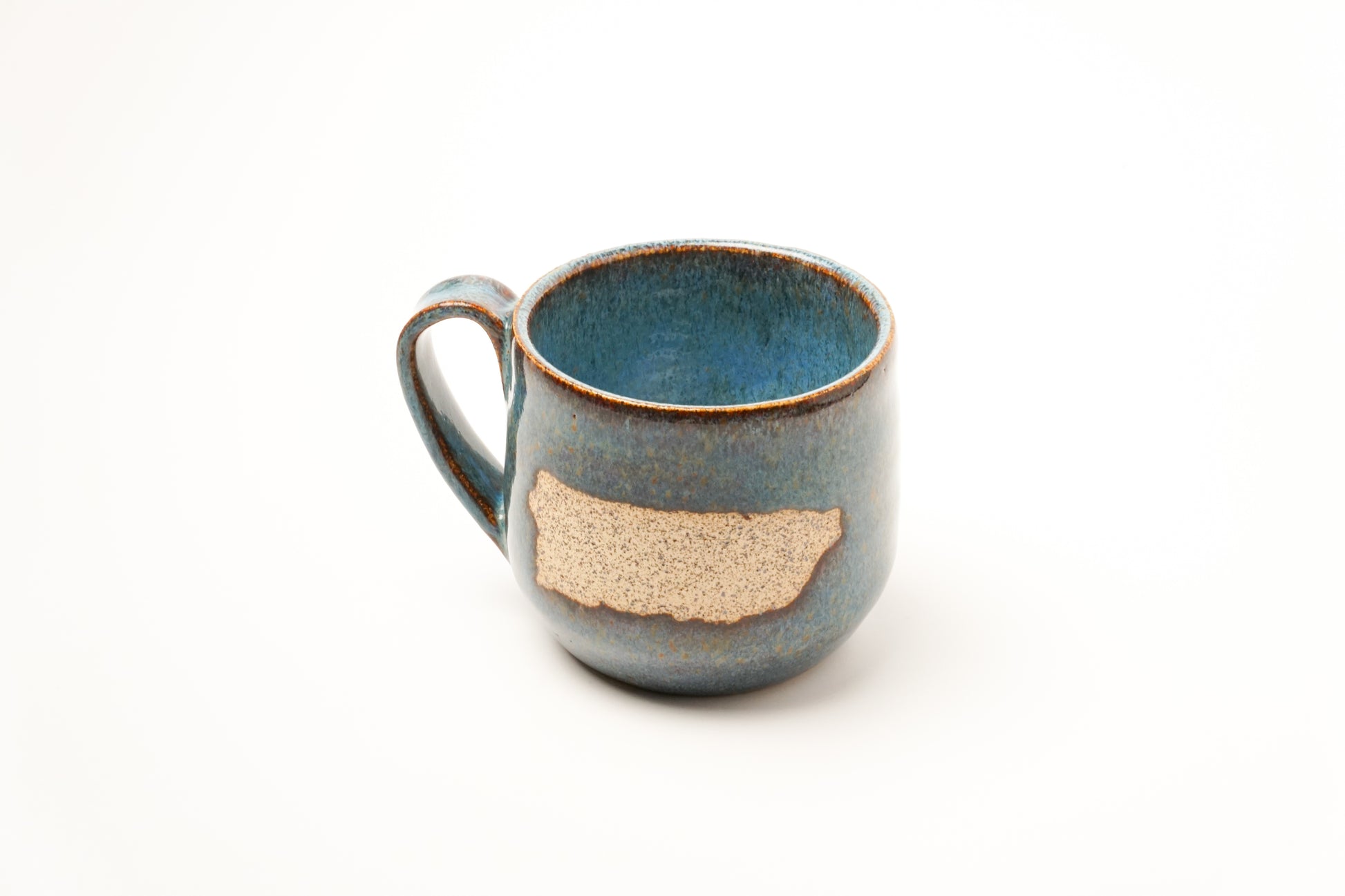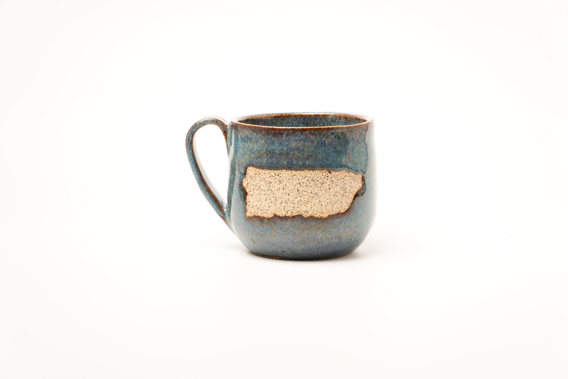 Taza hecha en el torno alfarero en barro gres pecoso quemado.