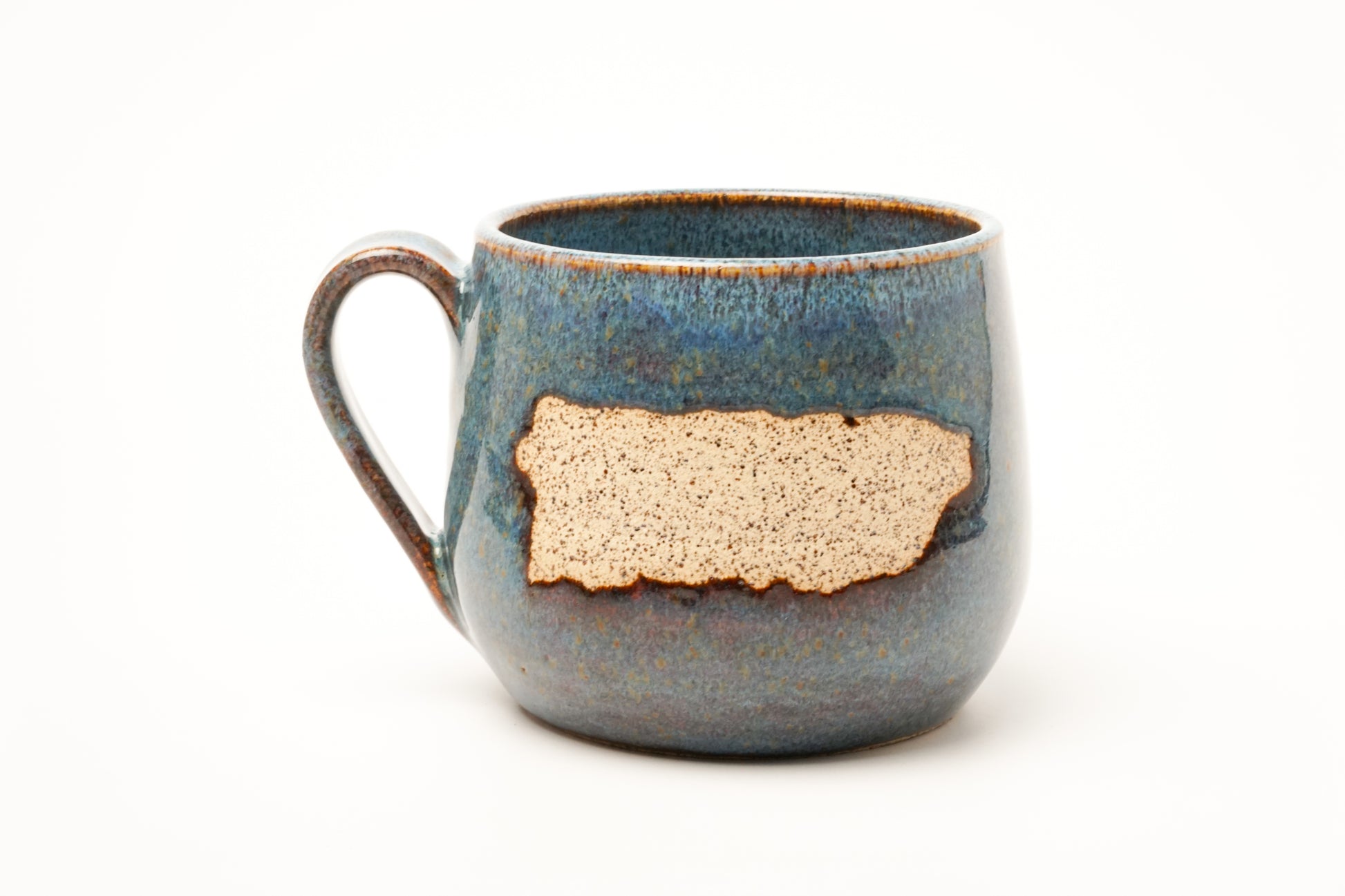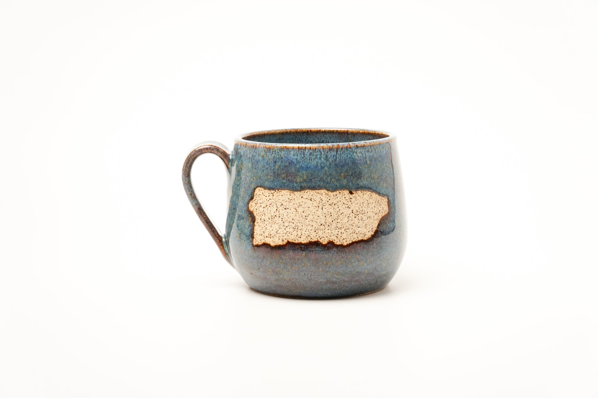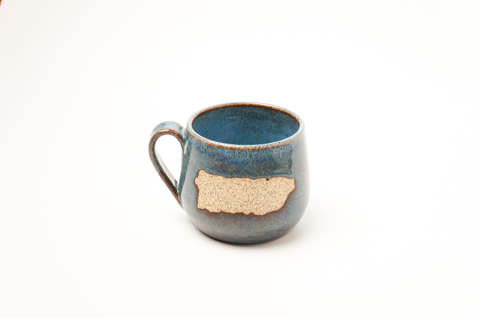 Taza hecha en el torno alfarero en barro gres pecoso quemado.