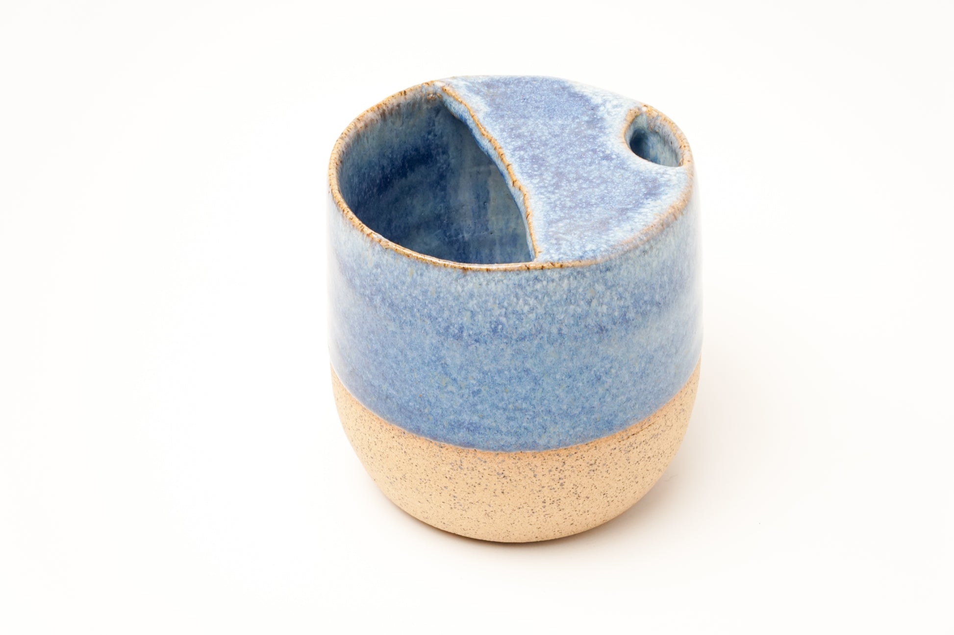Taza hecha en el torno alfarero en barro gres pecoso.