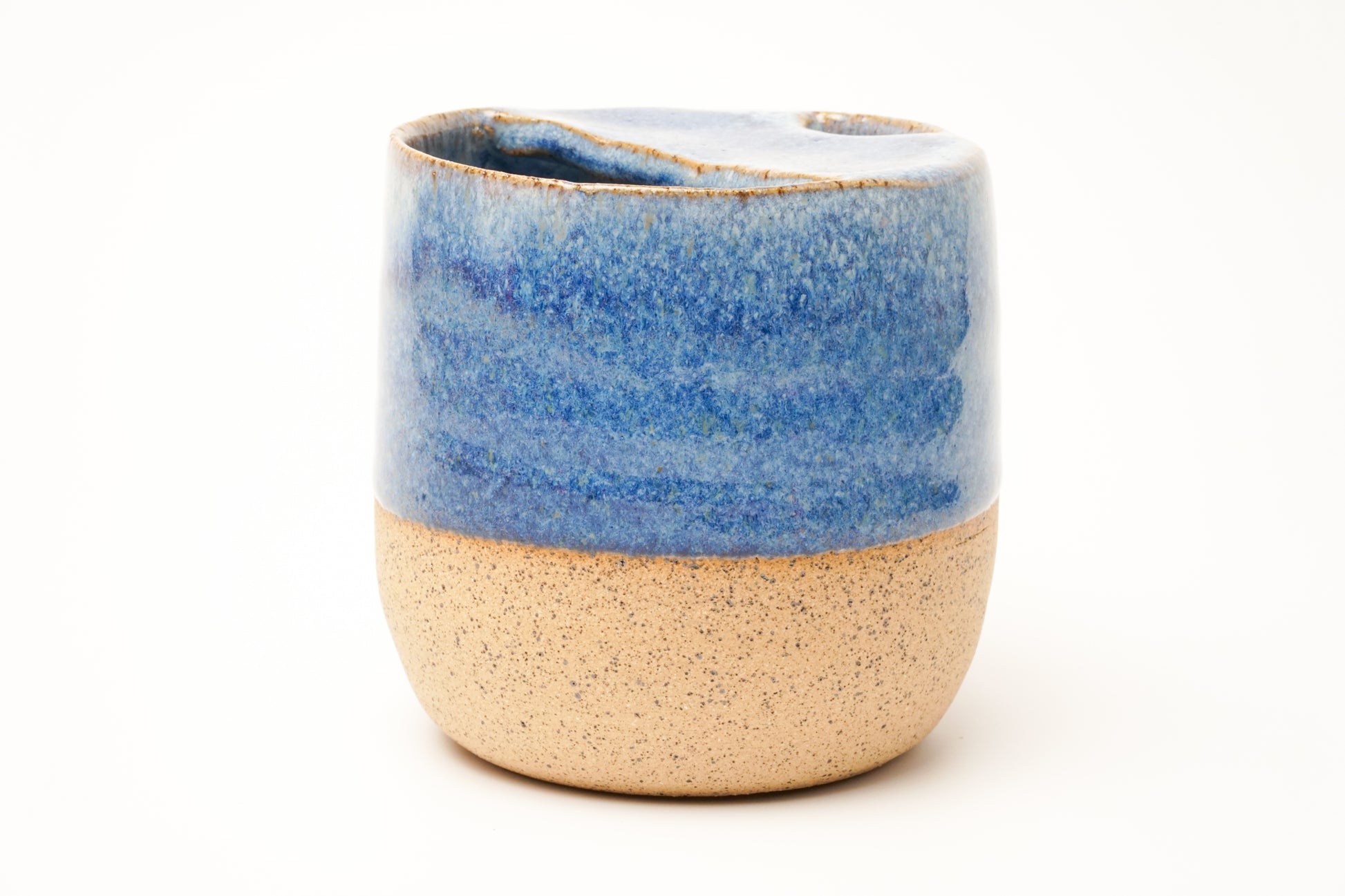 Wheel thrown To go cup in a tan speckled stoneware clay.