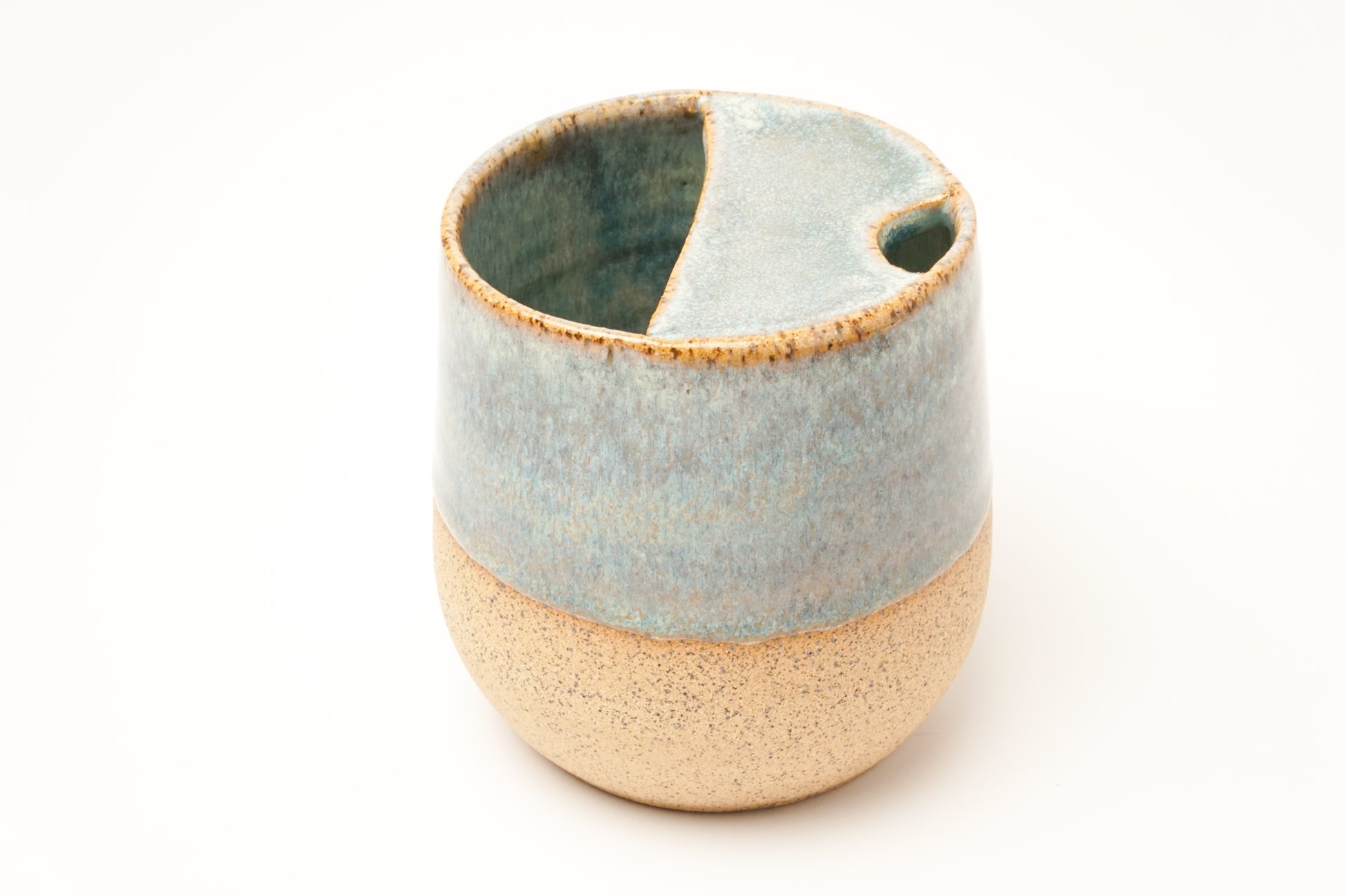 Taza hecha en el torno alfarero en barro gres pecoso.