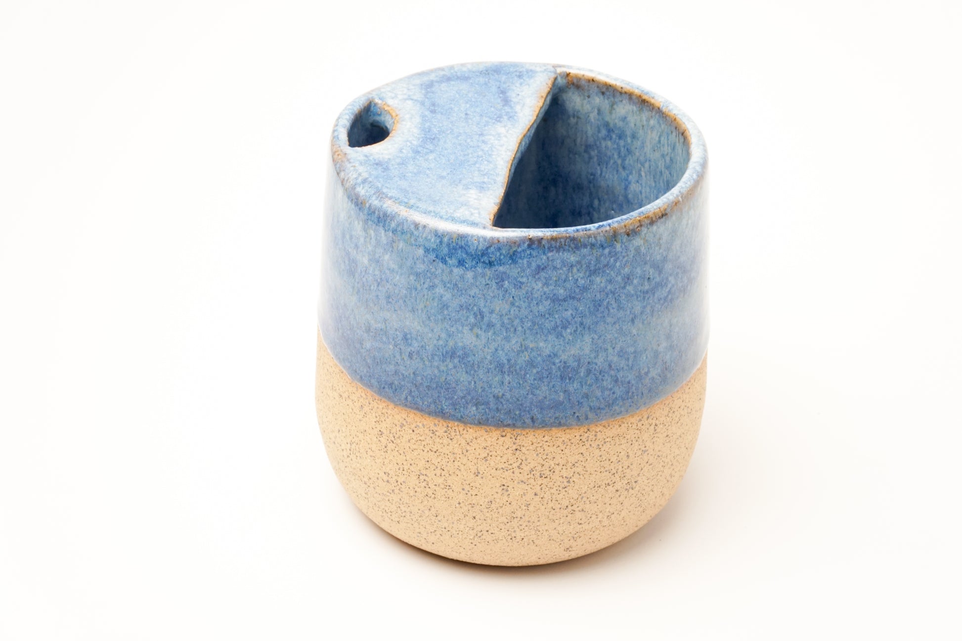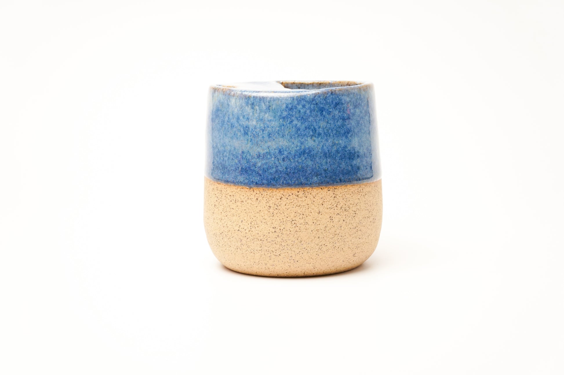 Taza hecha en el torno alfarero en barro gres pecoso.