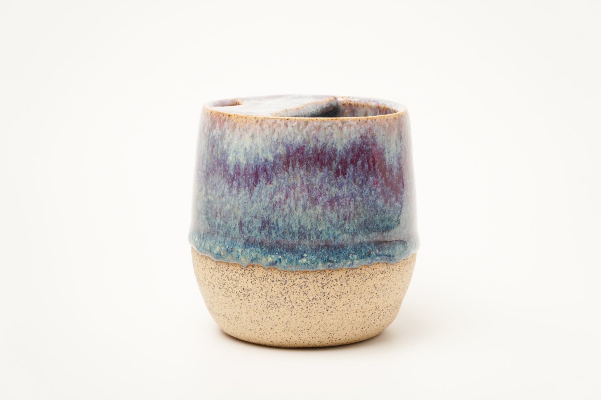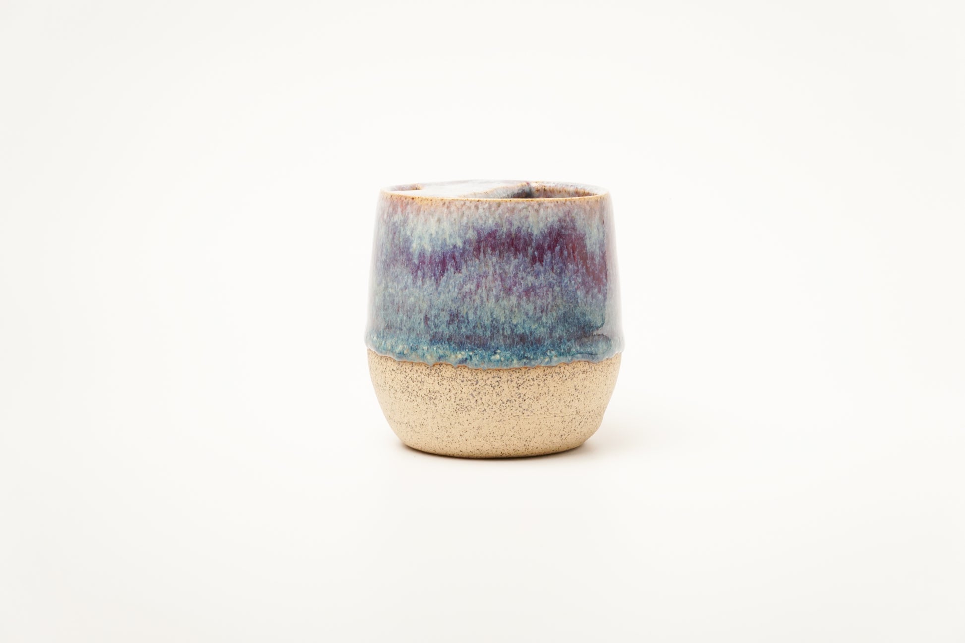 Taza hecha en el torno alfarero en barro gres pecoso.